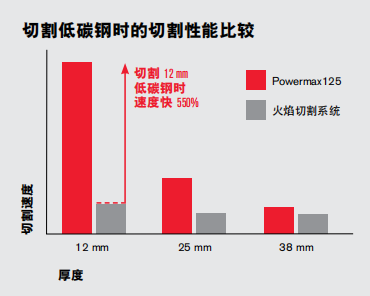 ? 在切割 12 mm 低碳鋼時,切割速度比火焰切割快 5 倍,